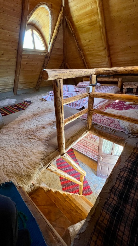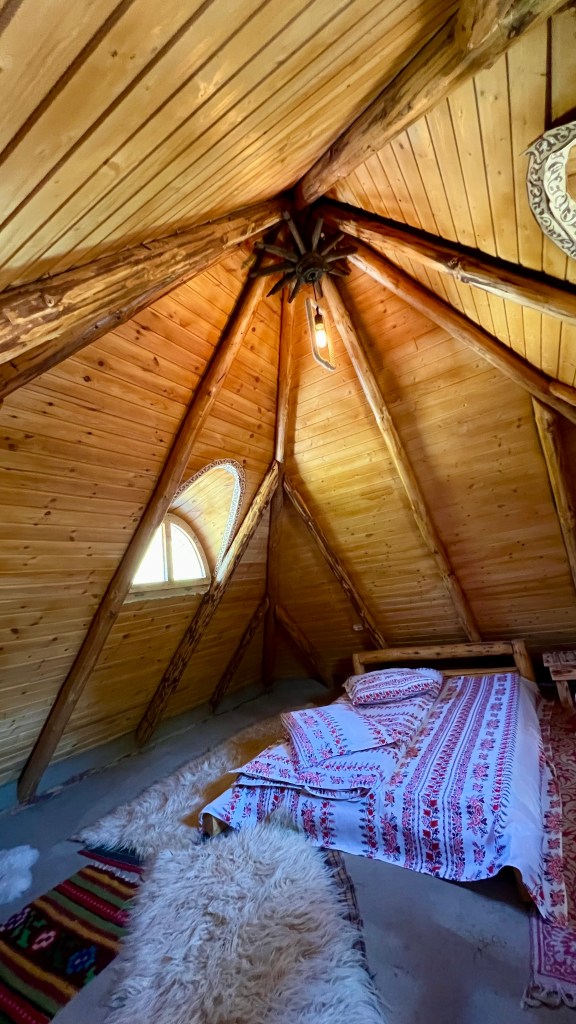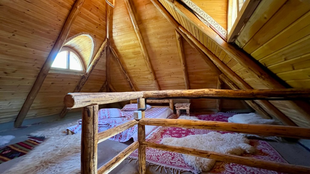 Mansarda este amenajată într-un stil minimalist, îmbinând elemente rustice tradiționale. Parfumul materialelor naturale din care este construită casa, patul robust din lemn așezat direct pe podea, precum și căldura luminii ce se filtrează prin ferestrele mansardei vă vor transpune în atmosfera tradițională a locuinței și în modul de viață simplu al strămoșilor noștri.